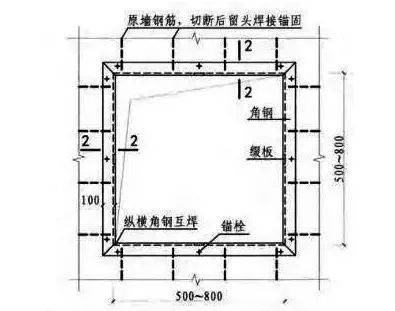 當開洞尺寸為500~800mm時,應在洞口外包型鋼邊框,型(xíng)鋼(gāng)框與混凝土結合後灌膠粘劑粘結(jié)為一體。